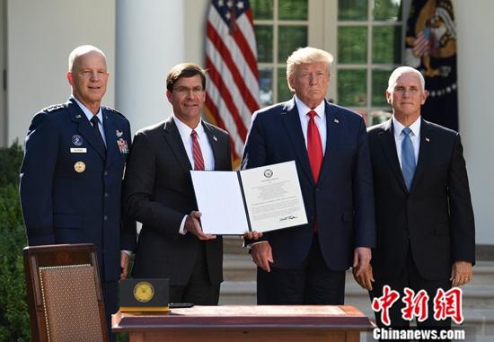 On August 29, local time, US President Trump announced at the White House that the US military formally established the Space Command. The picture shows U.S. Secretary of Defense Esper presenting the signed documents for the establishment of the Space Command. China News Service reporter Chen Mengtong photo