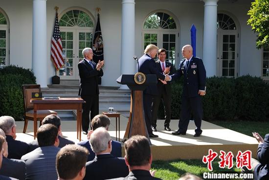On August 29, local time, US President Trump announced at the White House that the US military formally established the Space Command. The picture shows Trump shaking hands with Air Force Admiral John Raymond, who is to be nominated as commander of the Space Command. China News Service reporter Chen Mengtong photo